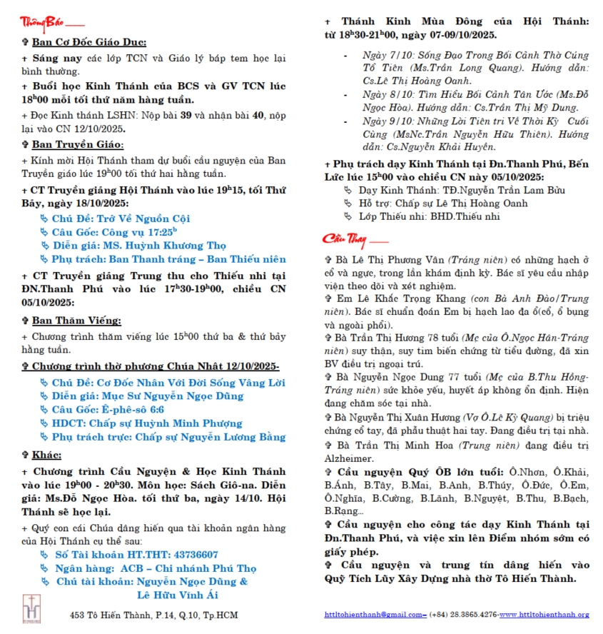 Thông Báo Chúa nhật 05-10-2025