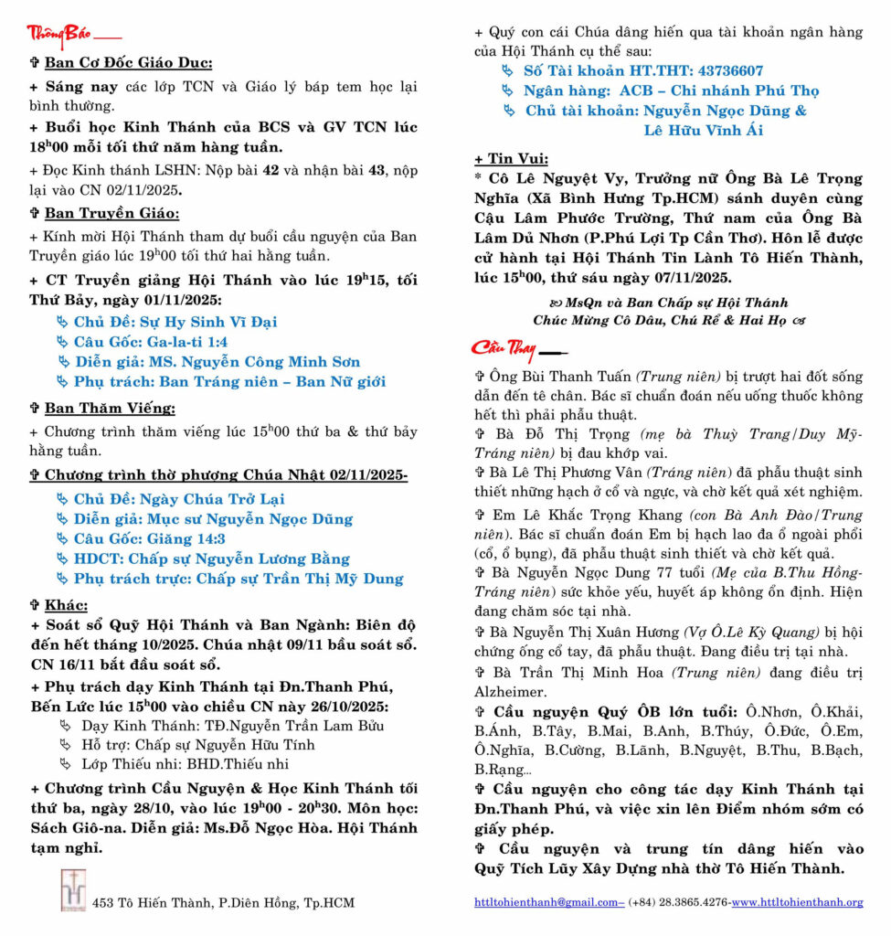 Thông Báo Chúa nhật 26-10-2025