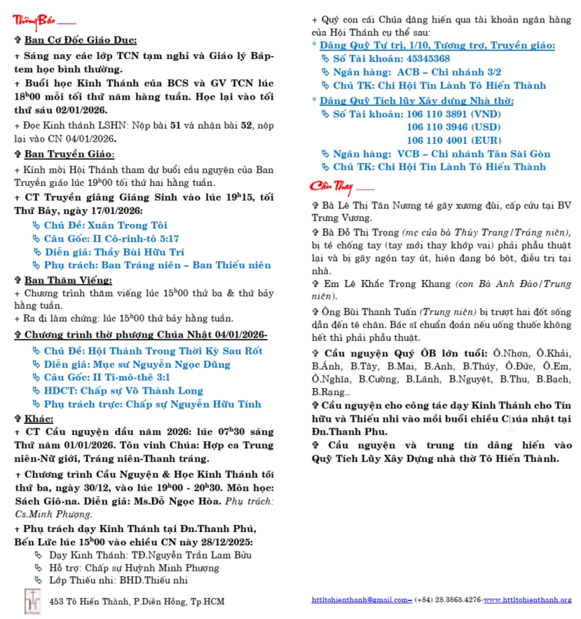 Thông Báo Chúa Nhật 28-12-2025