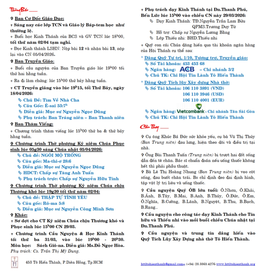 Thông Báo Chúa Nhật 29-03-2026